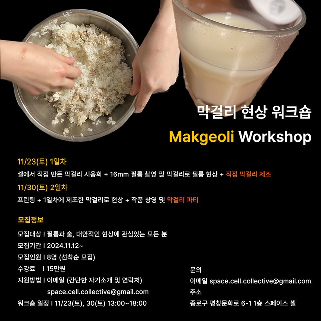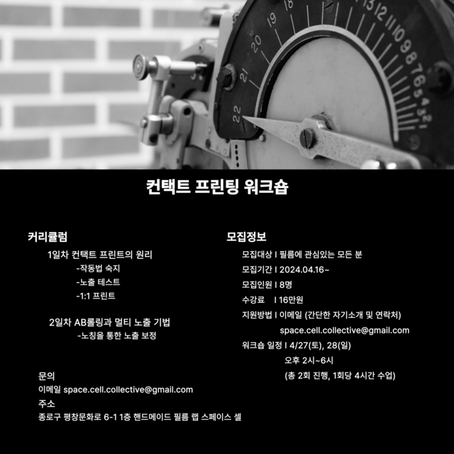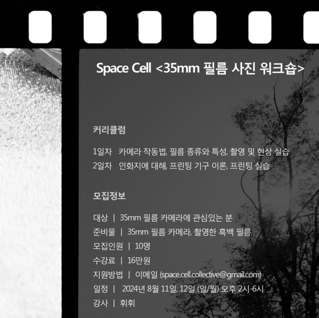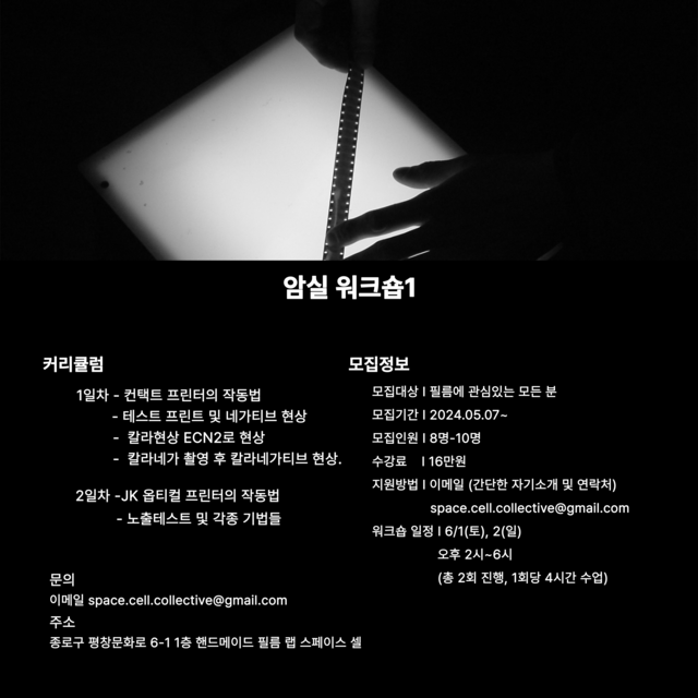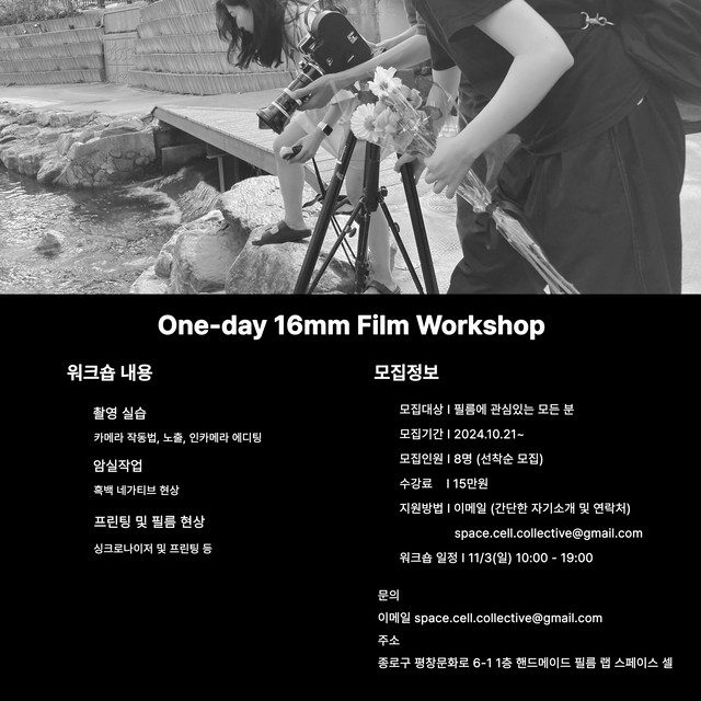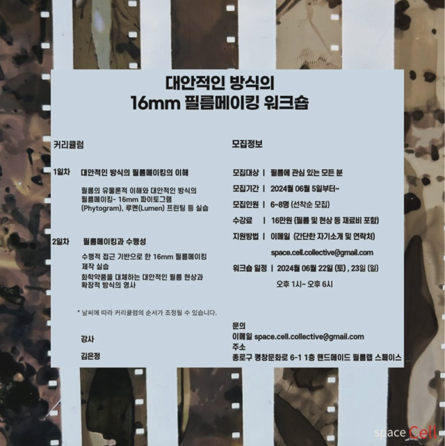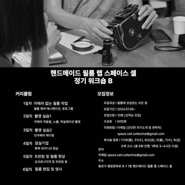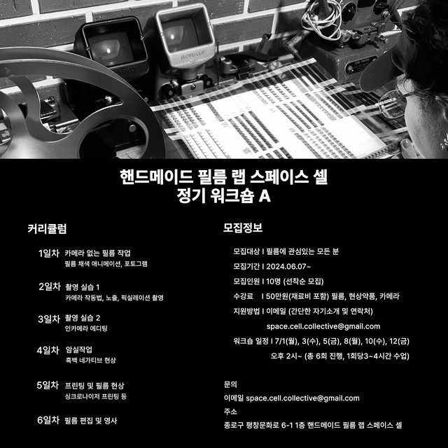 SPACE CELLregularly hosts workshops to share the working process of 8mm and 16mm film. These workshops cover filming and darkroom techniques for processing and printing, allowing participants to learn various skills for in-depth and creative film work. Additionally, SPACE CELL occasionally invites experimental filmmakers from Korea and abroad to hold special workshops where they share their unique methods and insights.줄 바꿈(BR 태그)은 Shift + Enter 로 사용할 수 있습니다.